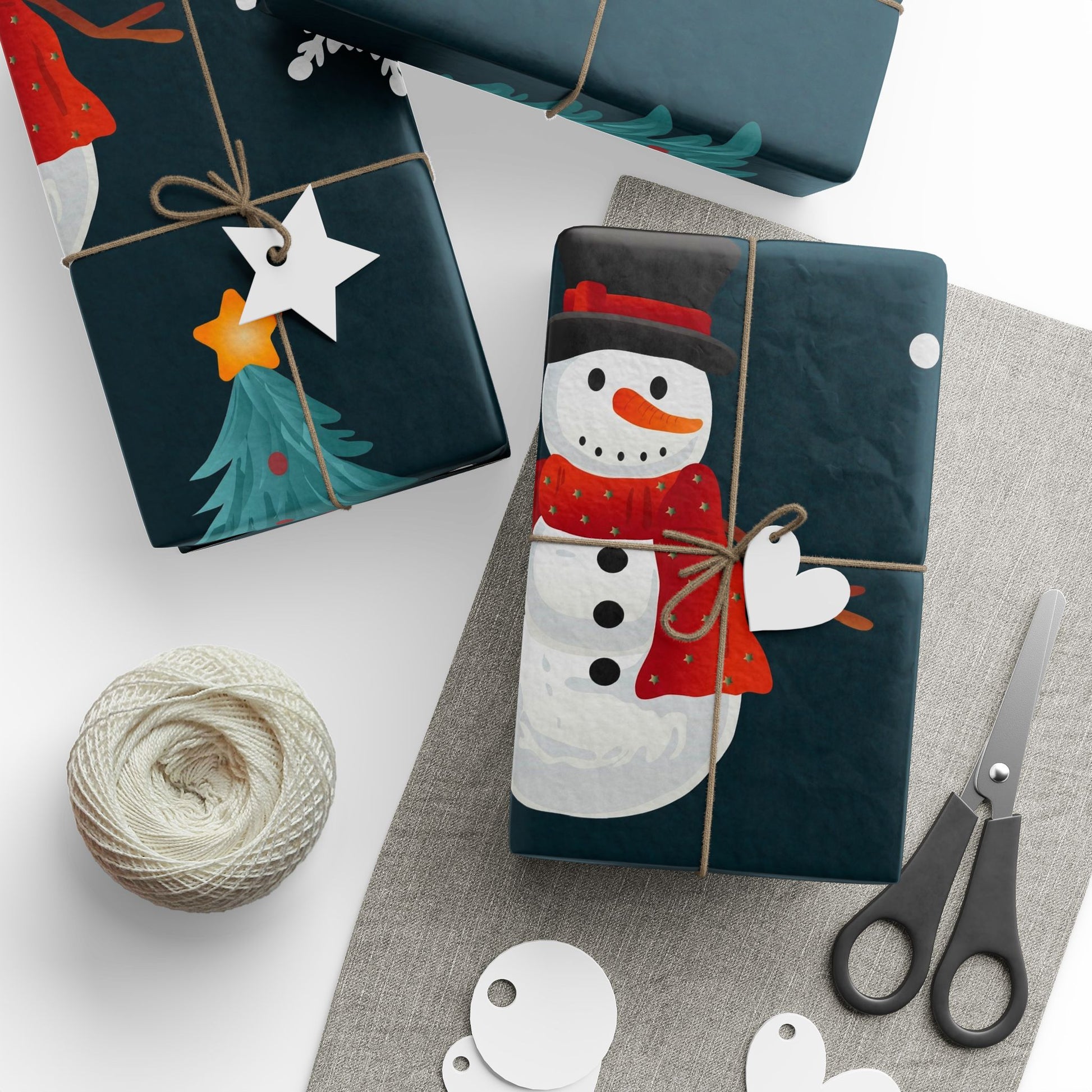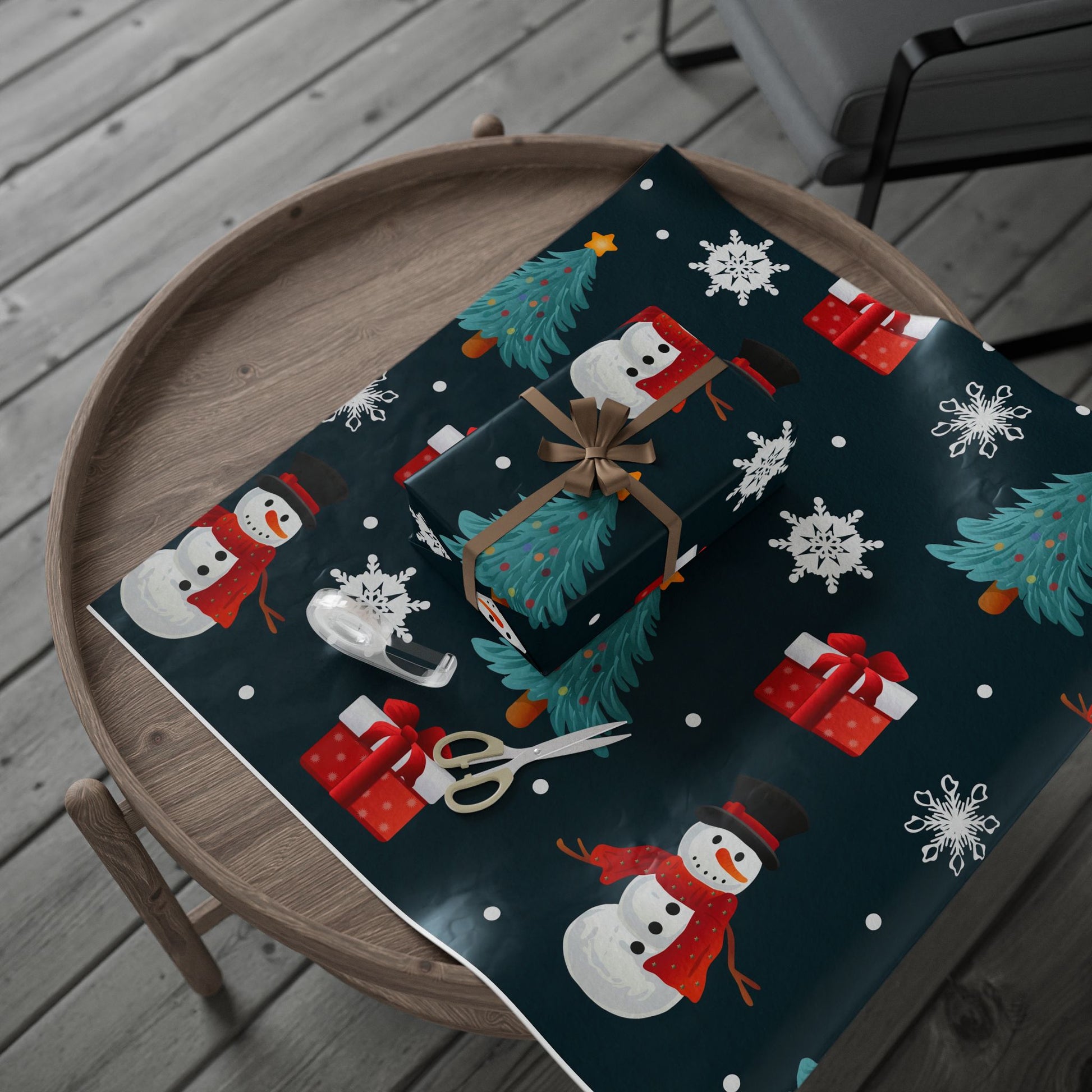 Soft snowflakes drift across a deep midnight background while cheerful snowmen, twinkling evergreen trees, and bright red presents repeat in a playful pattern. This wrapping paper brings a cozy, handcrafted holiday mood to every gift — think warm kitchen gatherings, cookie exchanges, and the hush of a winter evening. It wraps childhood wonder and small joys into every parcel, making even a simple token feel thoughtfully presented. Use it for family stockings, neighbor treats, or boxed bakery delights to add a little nostalgic sparkle to the season.
